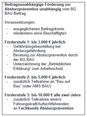 Die BG BAU unterstützt die Teilnahme von Führungskräften an den von Innungen und Verbänden angebotenen Seminaren und erstattet bis zu 400 Euro der Seminargebühren. Voraussetzung für eine mögliche Förderung ist das abgeschlossene E-Learning-Modul. Die Teilnahme am Seminar ermöglicht außerdem eine beitragsunabhängige Förderung mit bis zu 10.000 Euro für Investitionen in die Absturzprävention.
